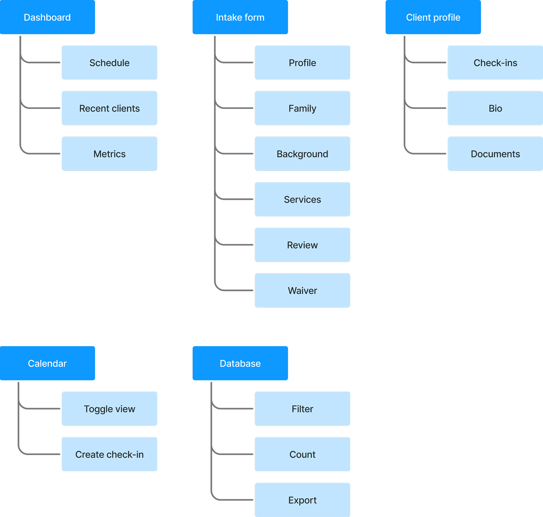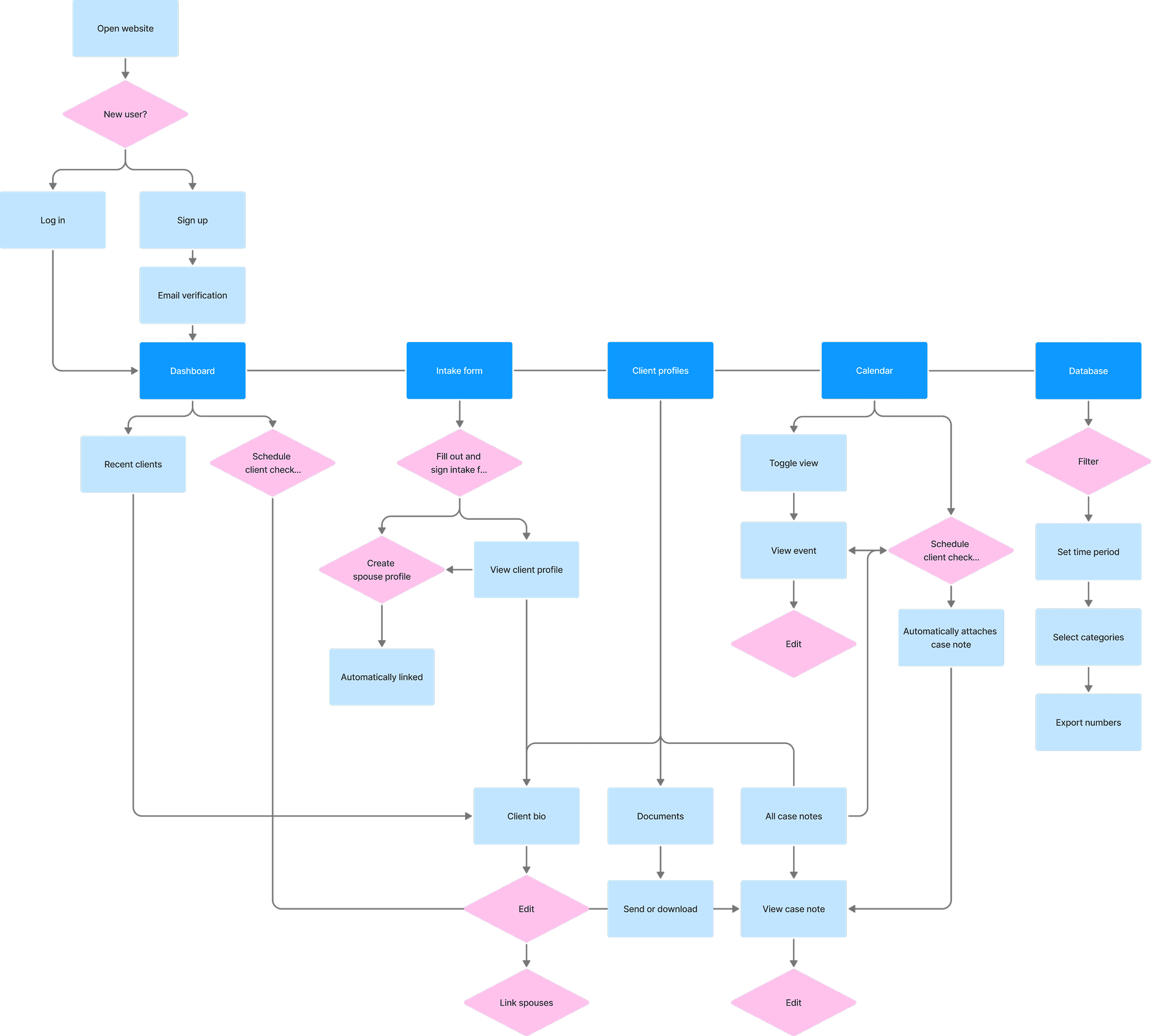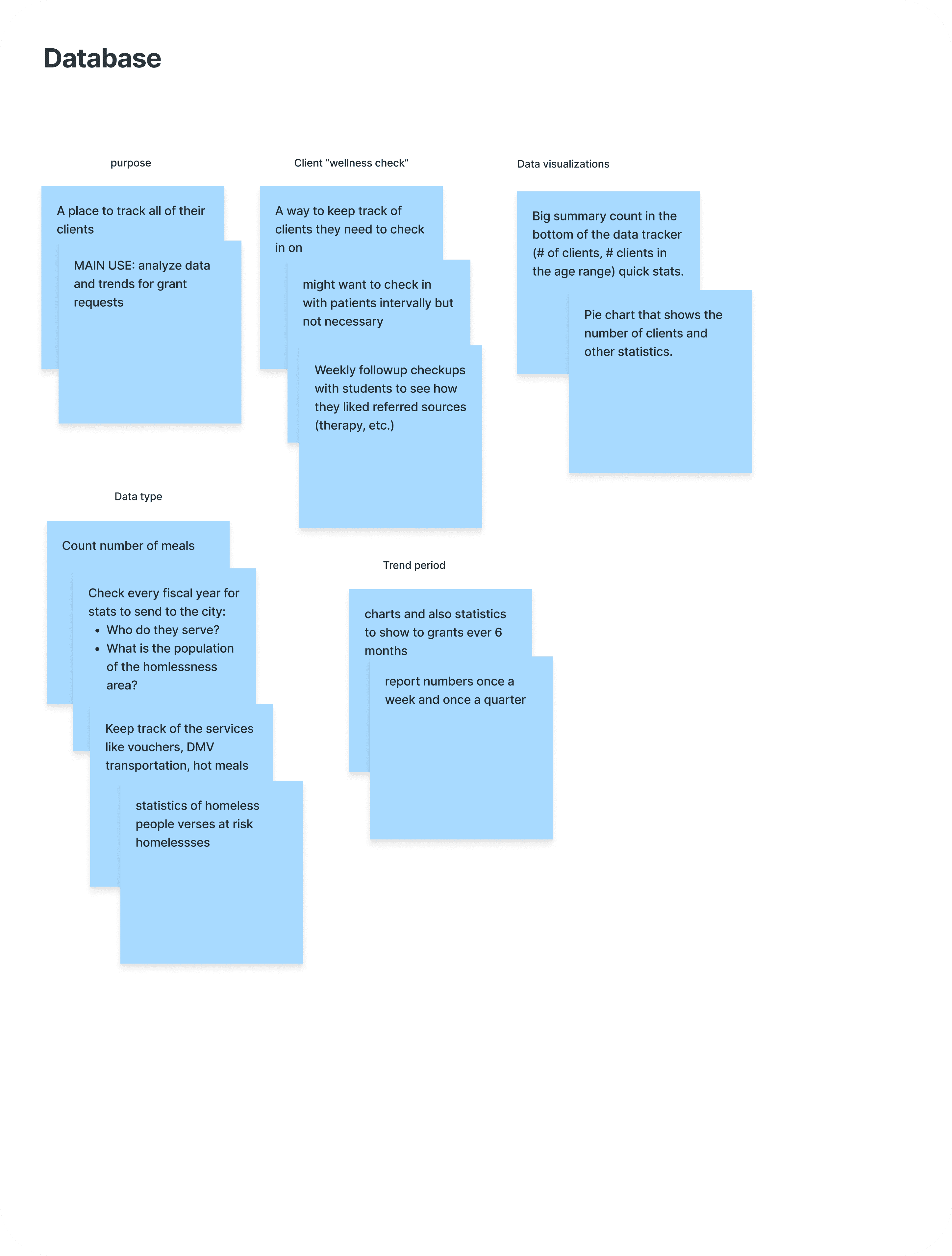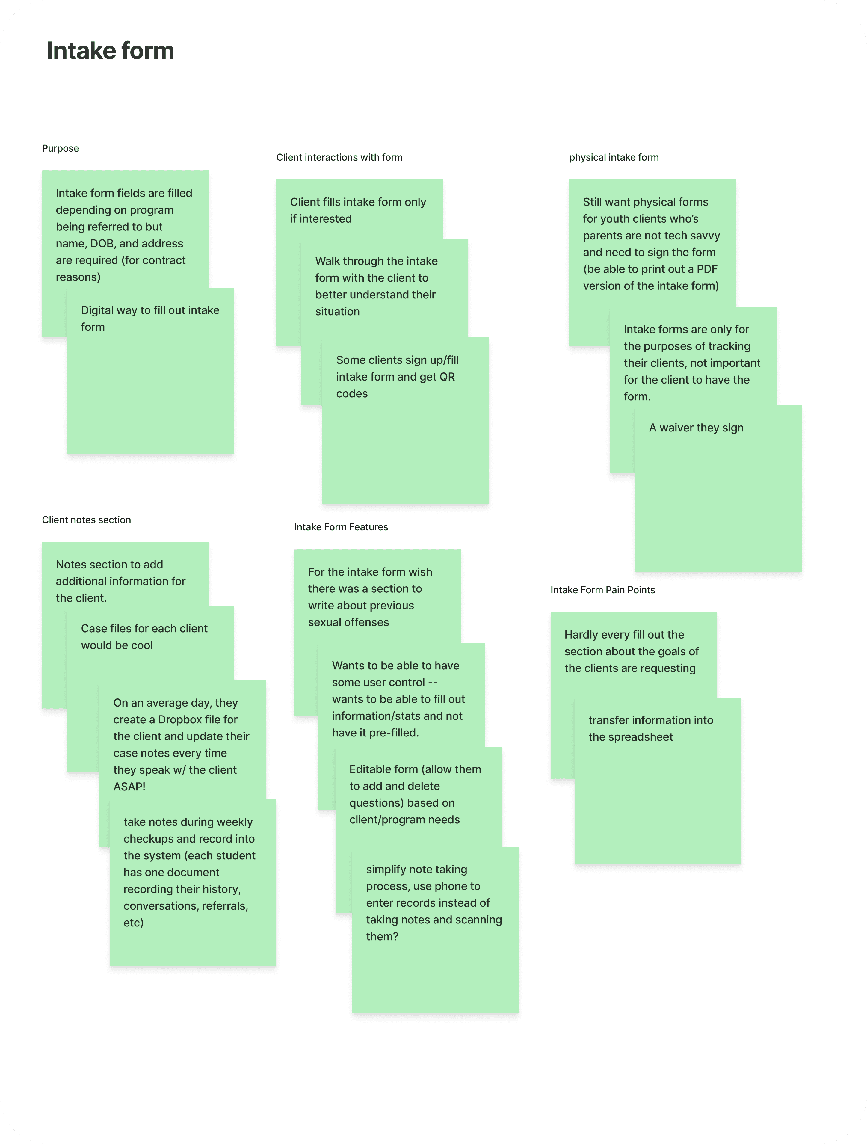 After sorting our insights, we mapped client intake, check-in, and data analysis workflows, pinpointing key frustration zones and opportunities for improvement.