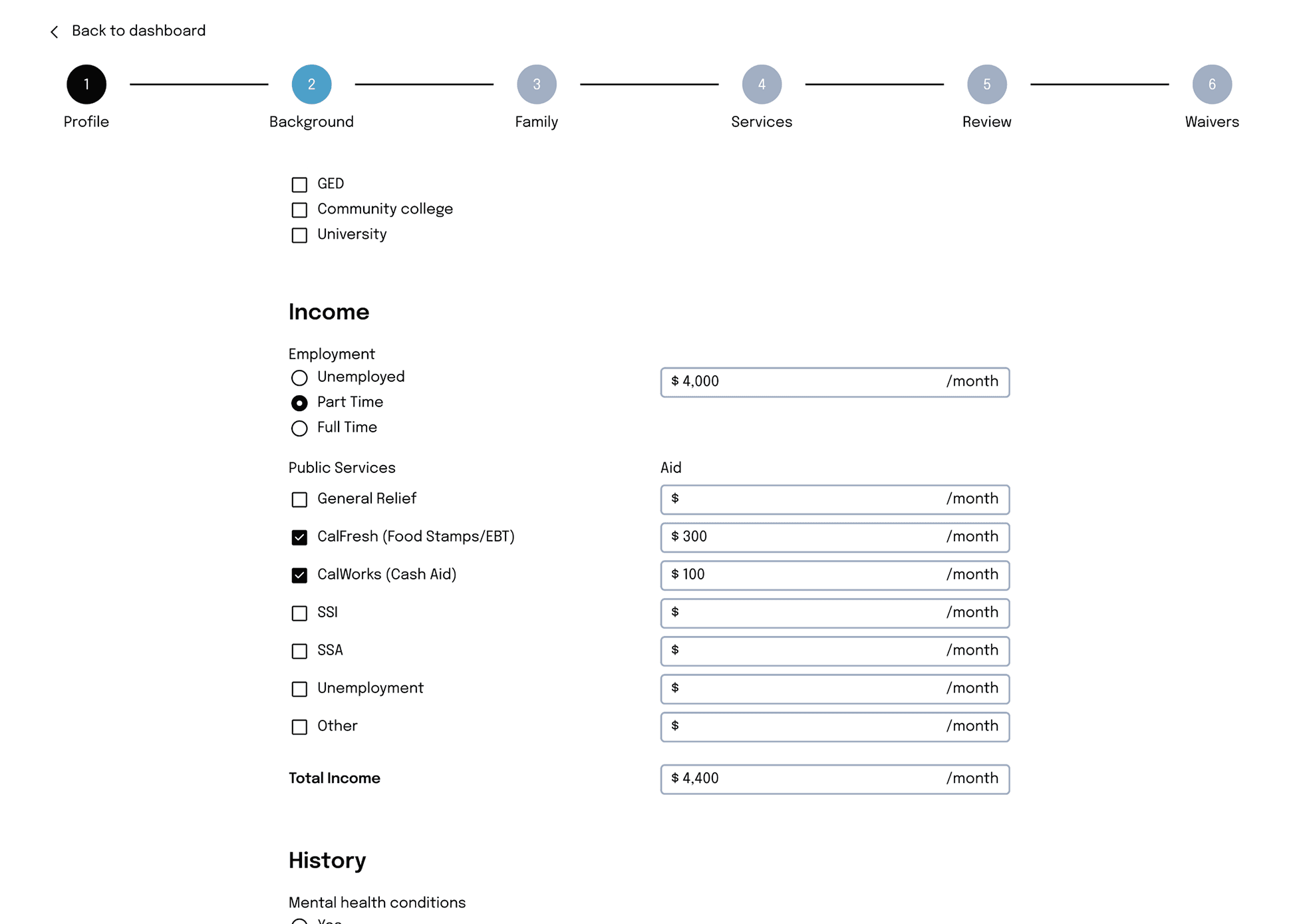 Collect client background, family, and medical history, with file upload