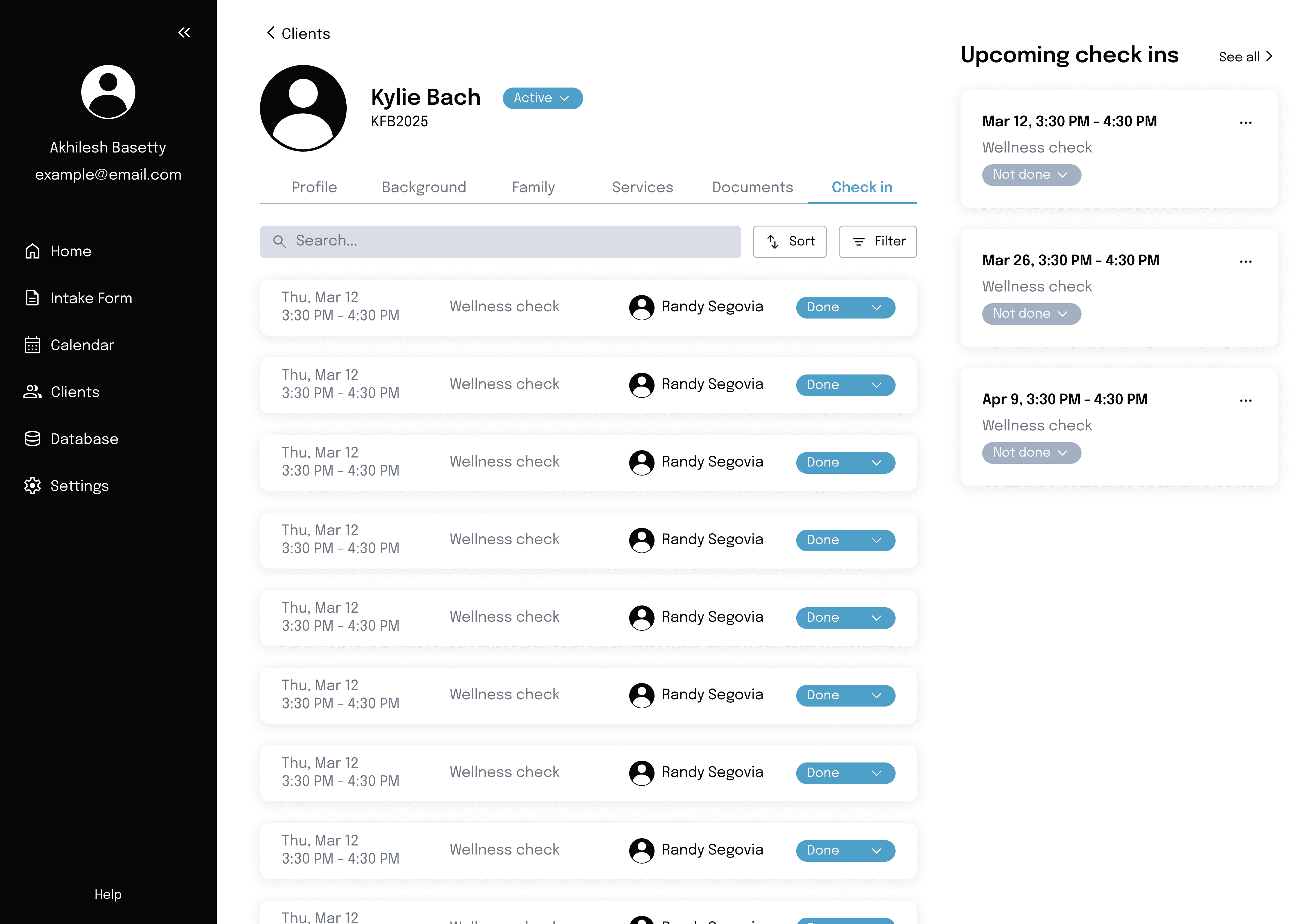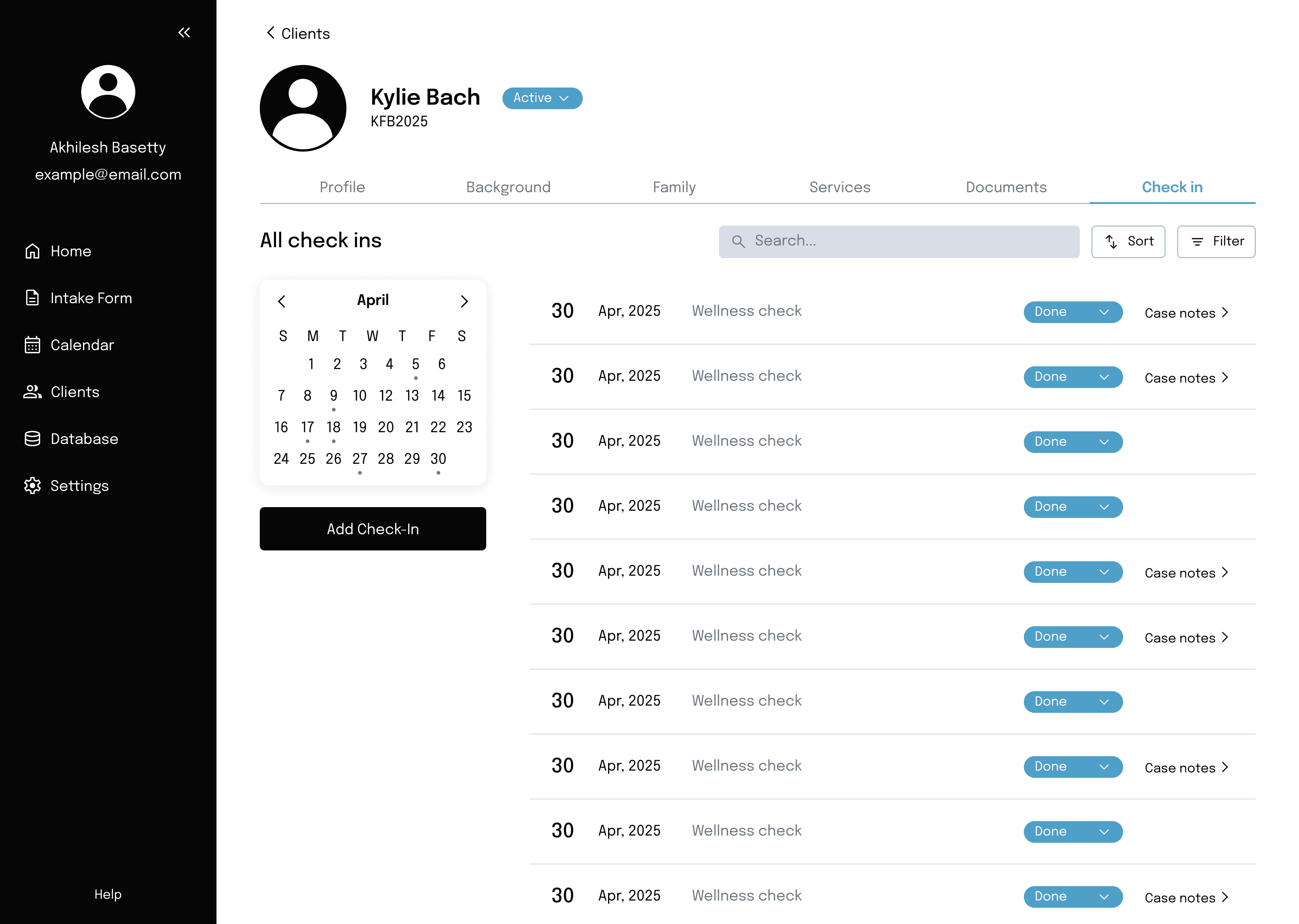 Each client’s profile page depicts their upcoming check-ins alongside their past check-ins, with associated case notes. My goal was to give staff a flexible way to refer to previous case notes.