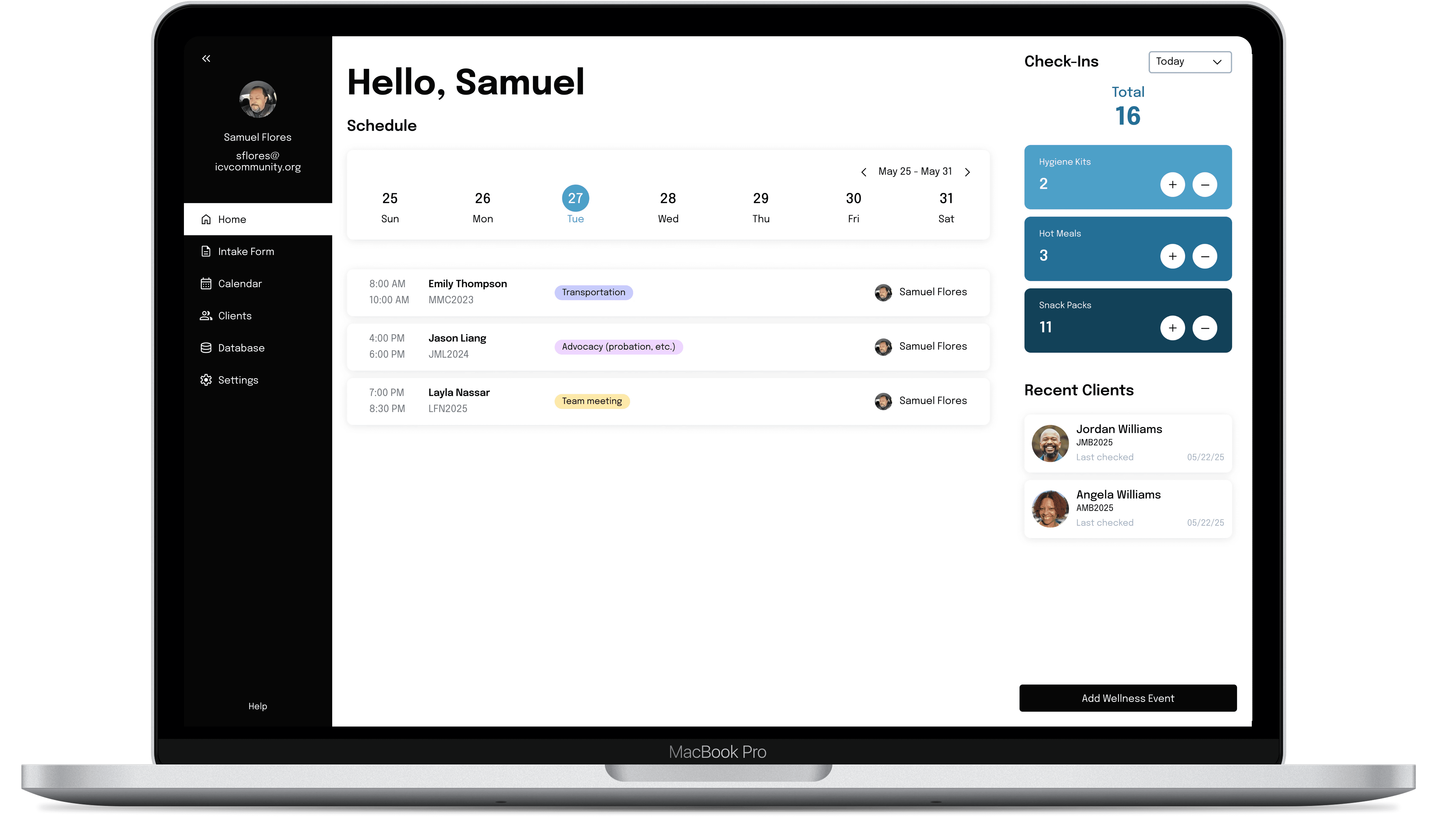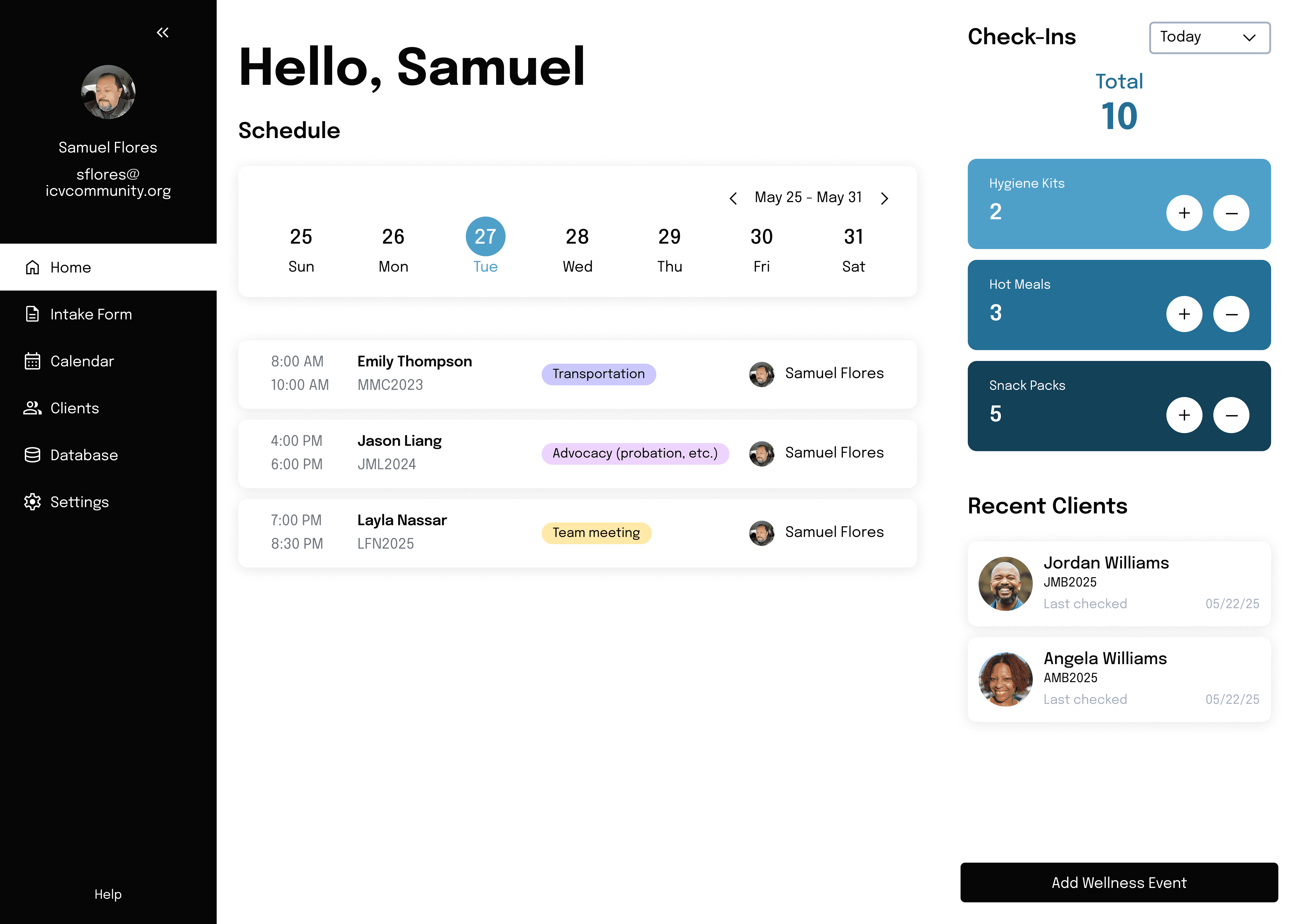 The staff start their day with what needs attention: upcoming check-ins, recent clients, and handout clickers for in-the-moment support.