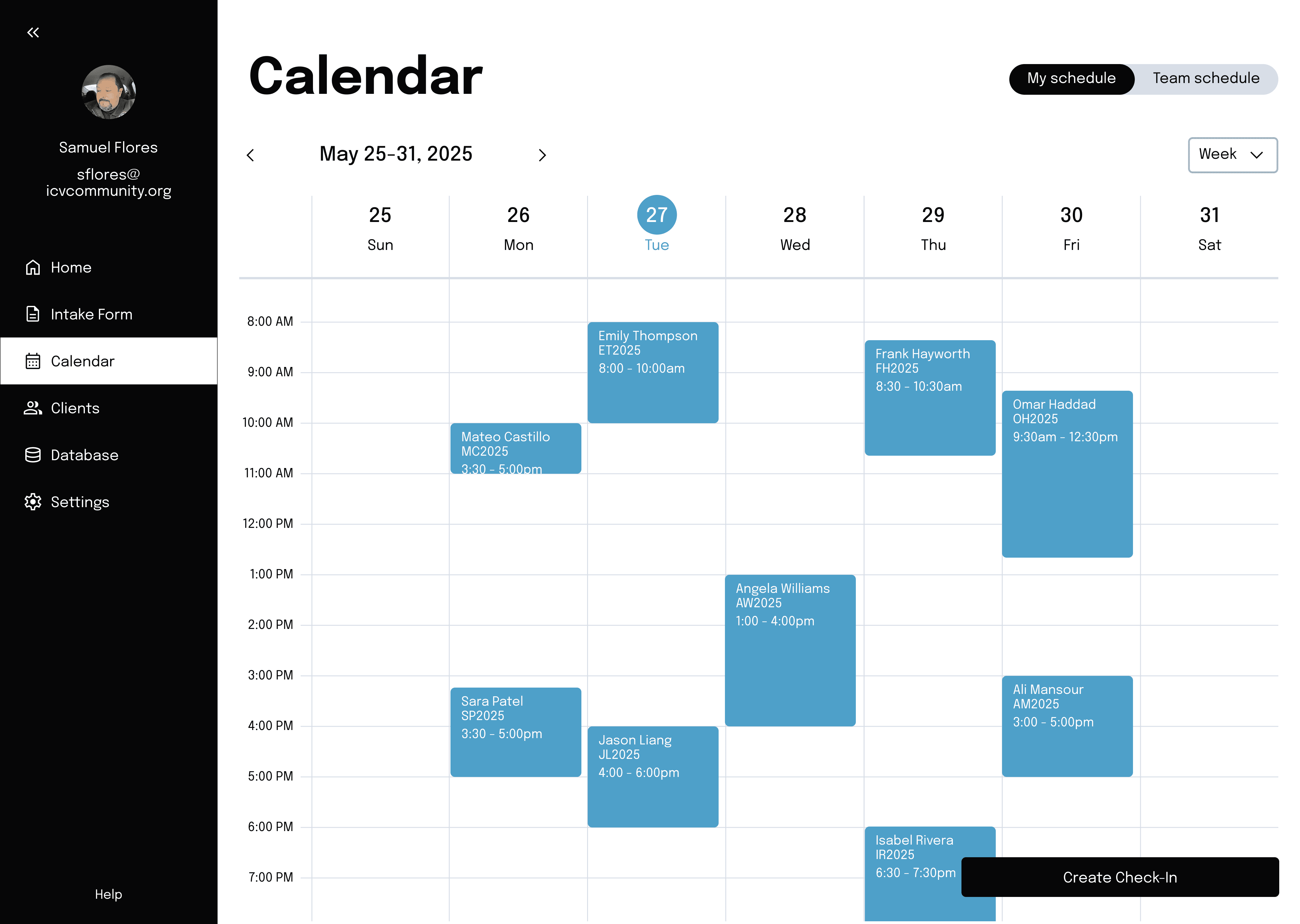 A shared calendar keeps check-ins visible and coordinated across the team.