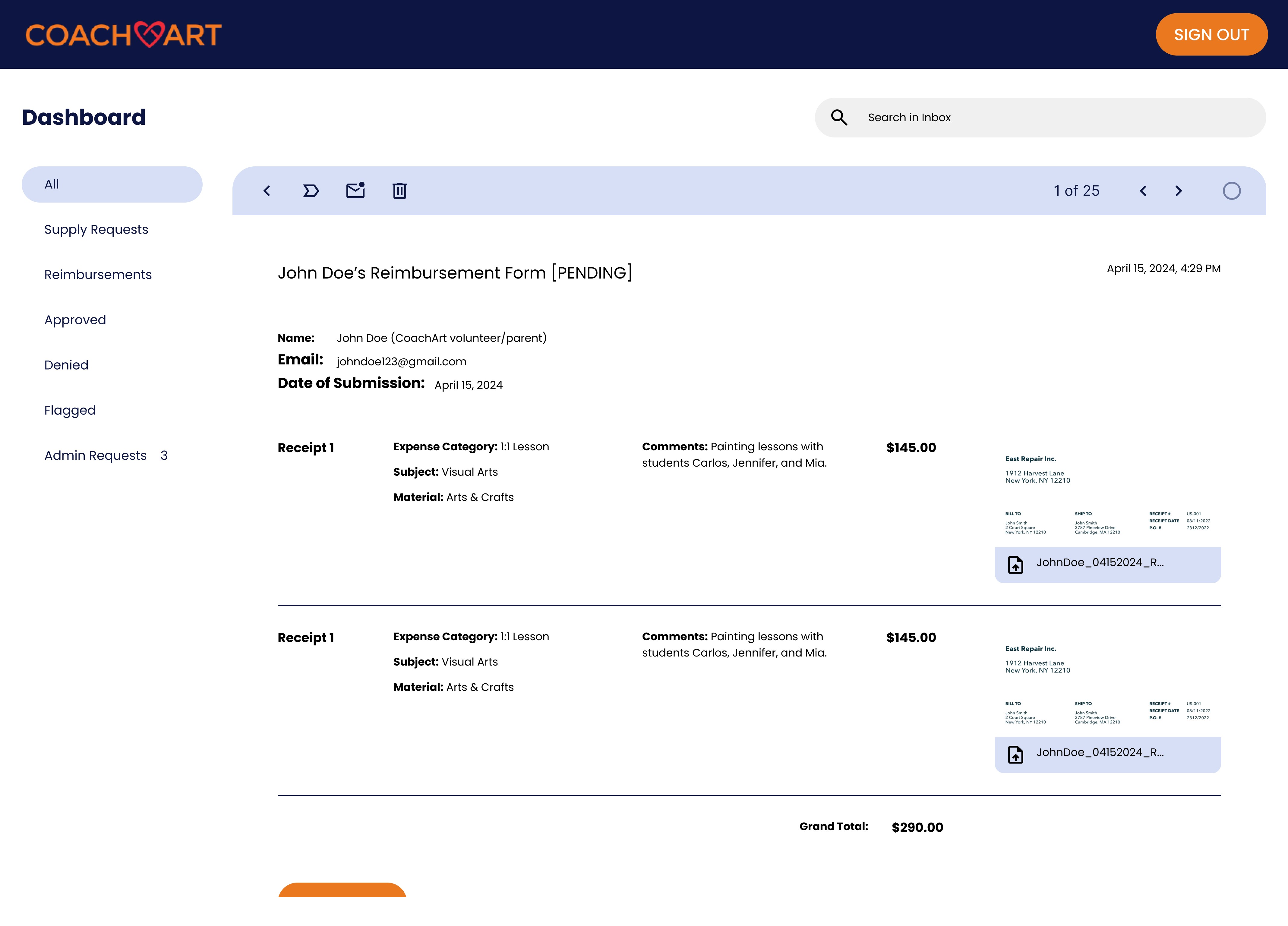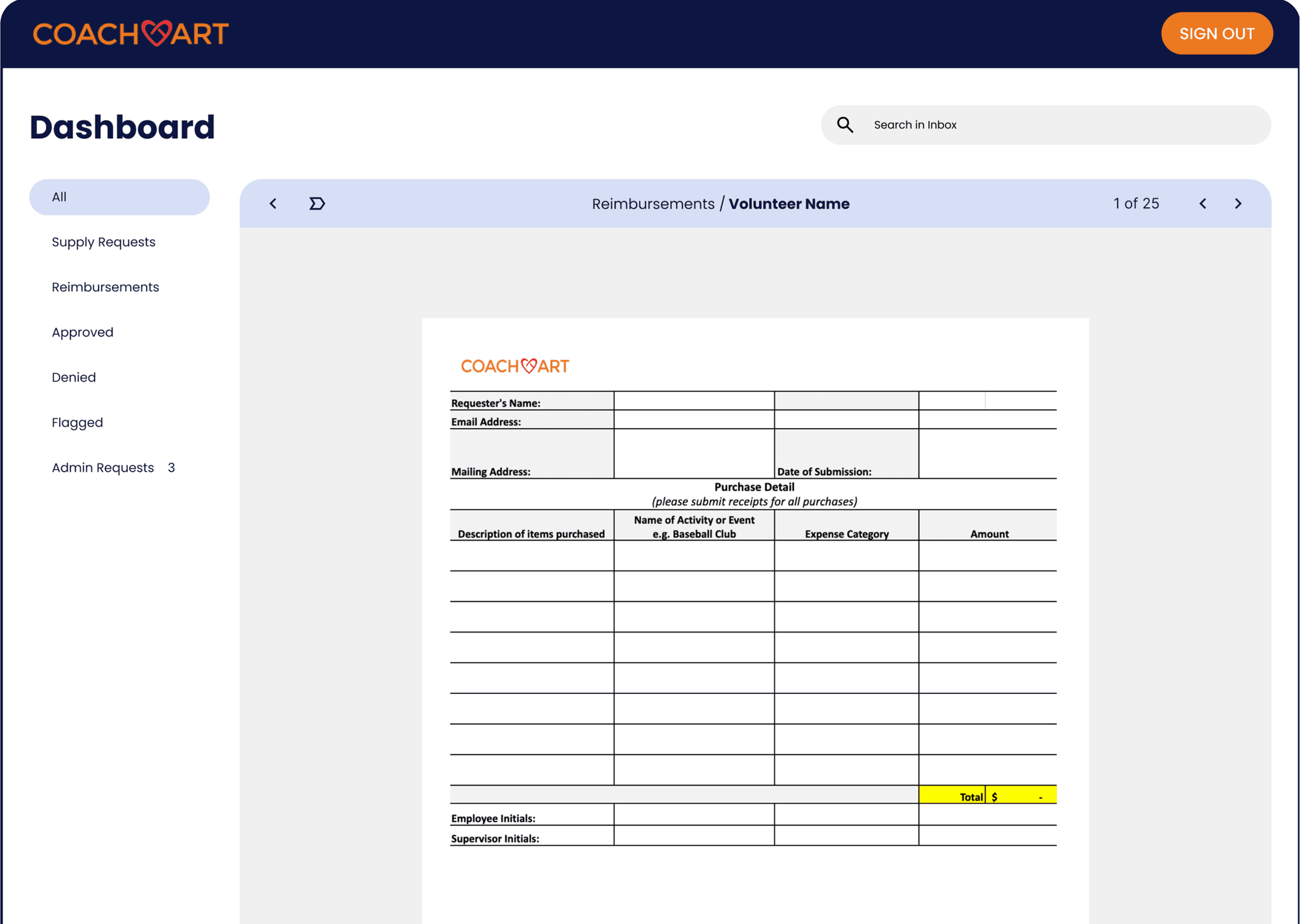 After purchasing supplies from his local art store, Mark opens CoachArt's reimbursement form to get reimbursed for his purchases.