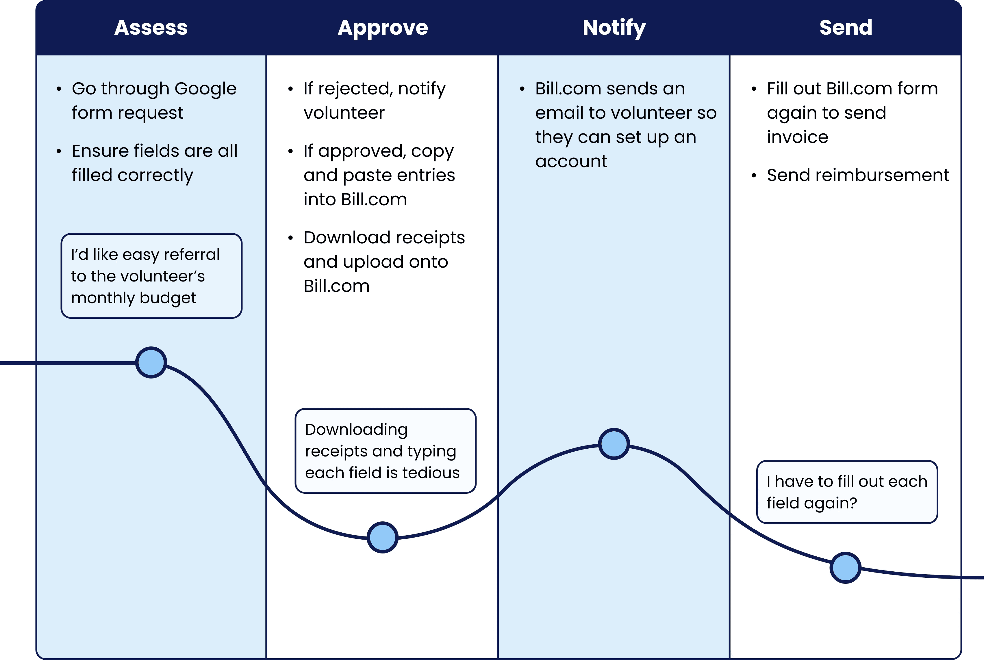 The reimbursement system was disjointed and full of friction, creating bottlenecks for administrators and confusion for volunteers. This led to: