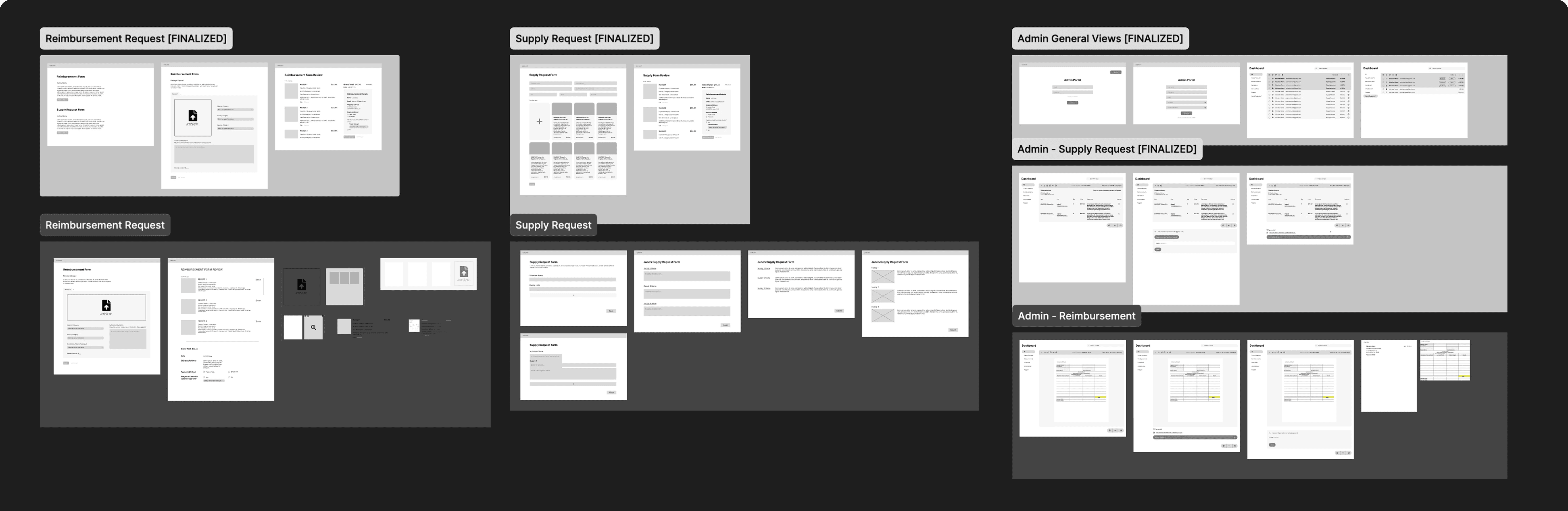 We began by building low-fidelity prototypes for three key workflows: the volunteer-facing reimbursement and supply request forms and the admin approval process