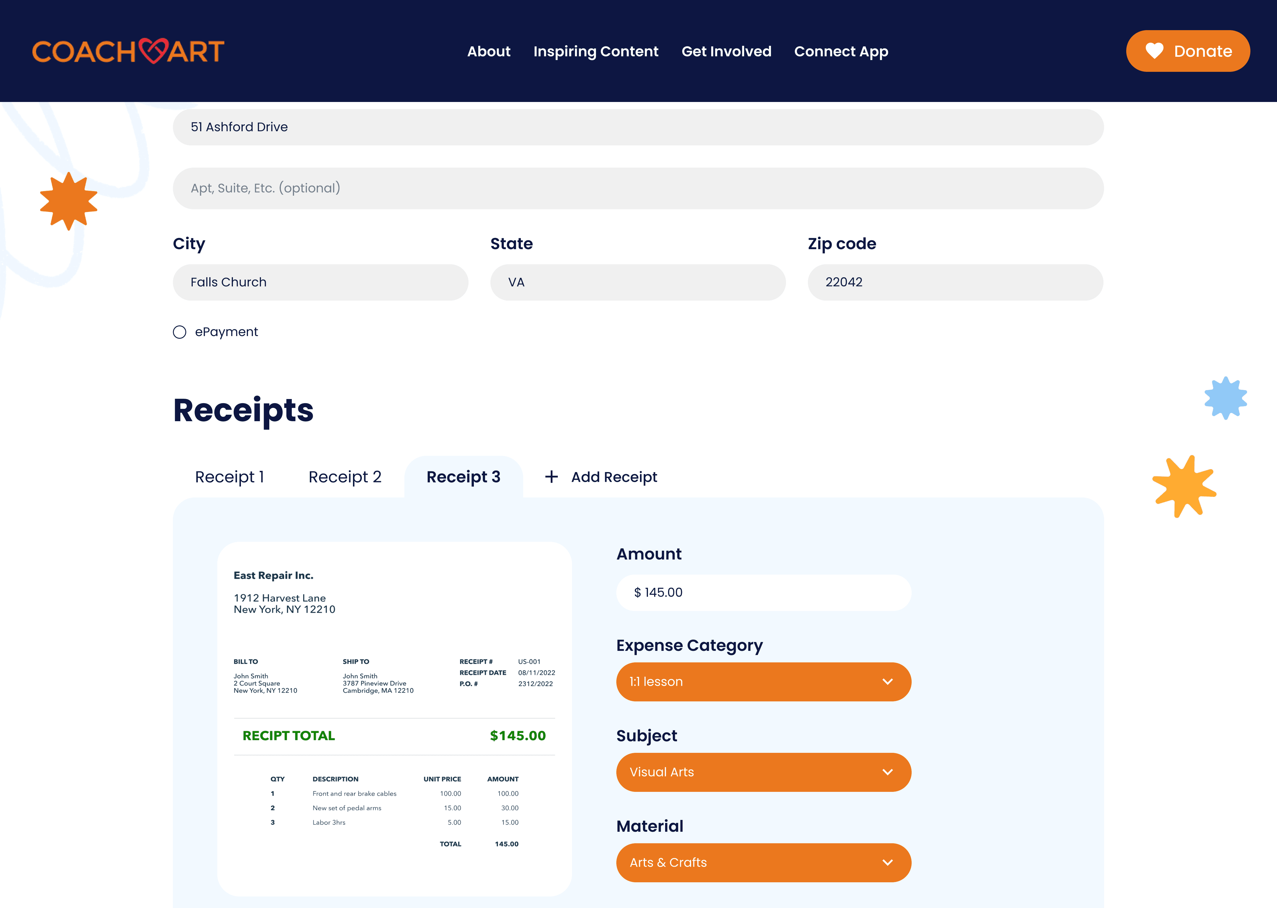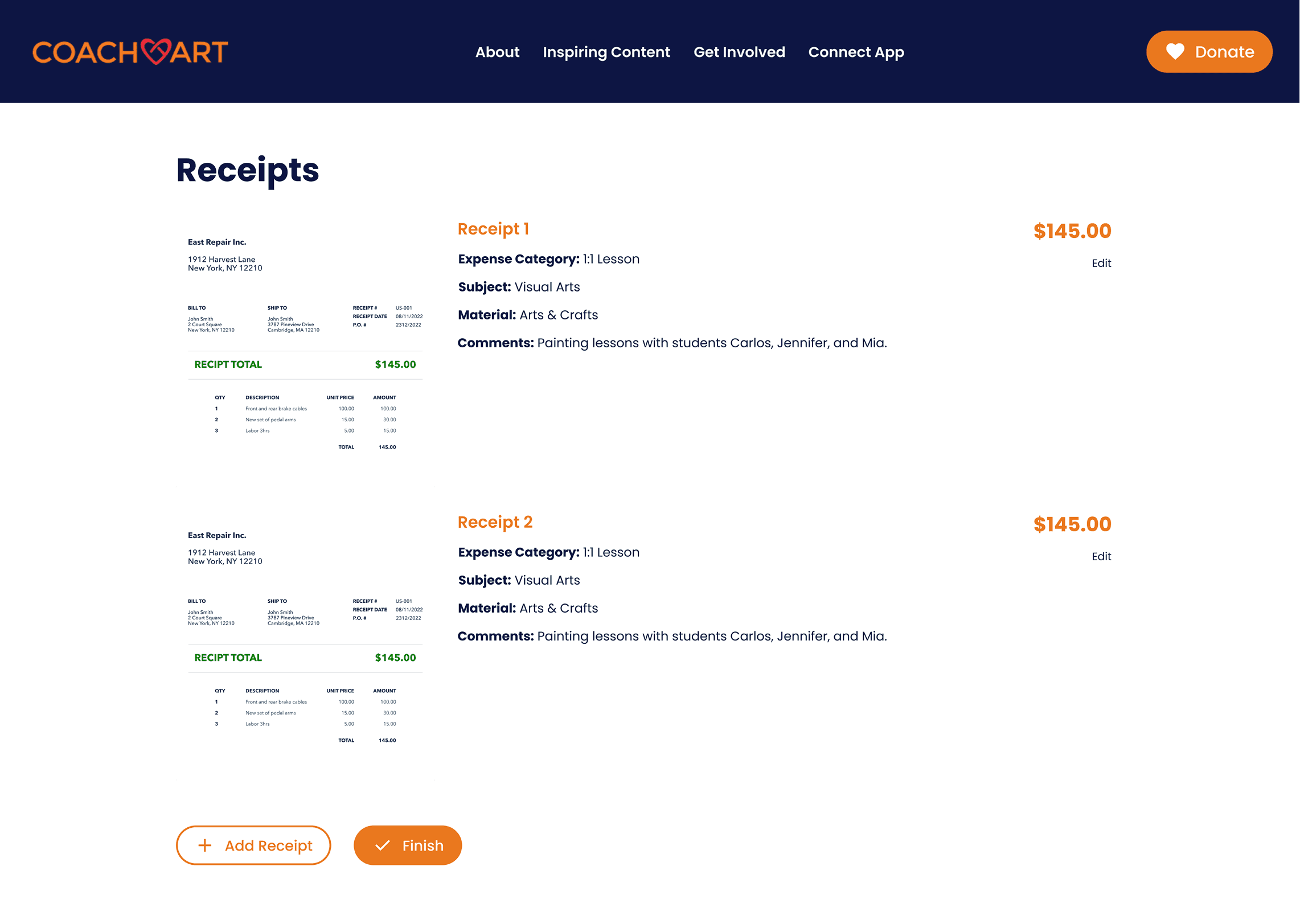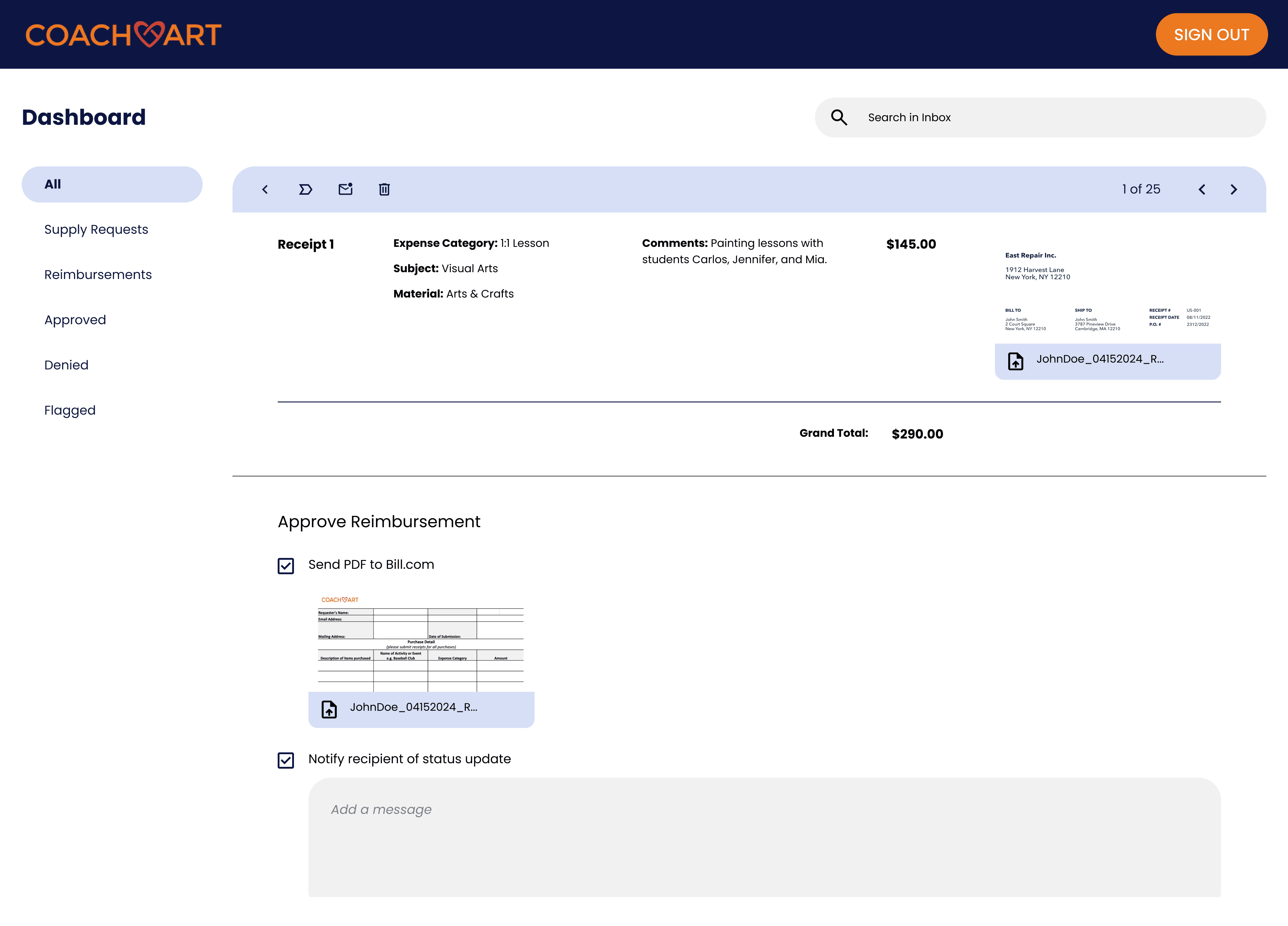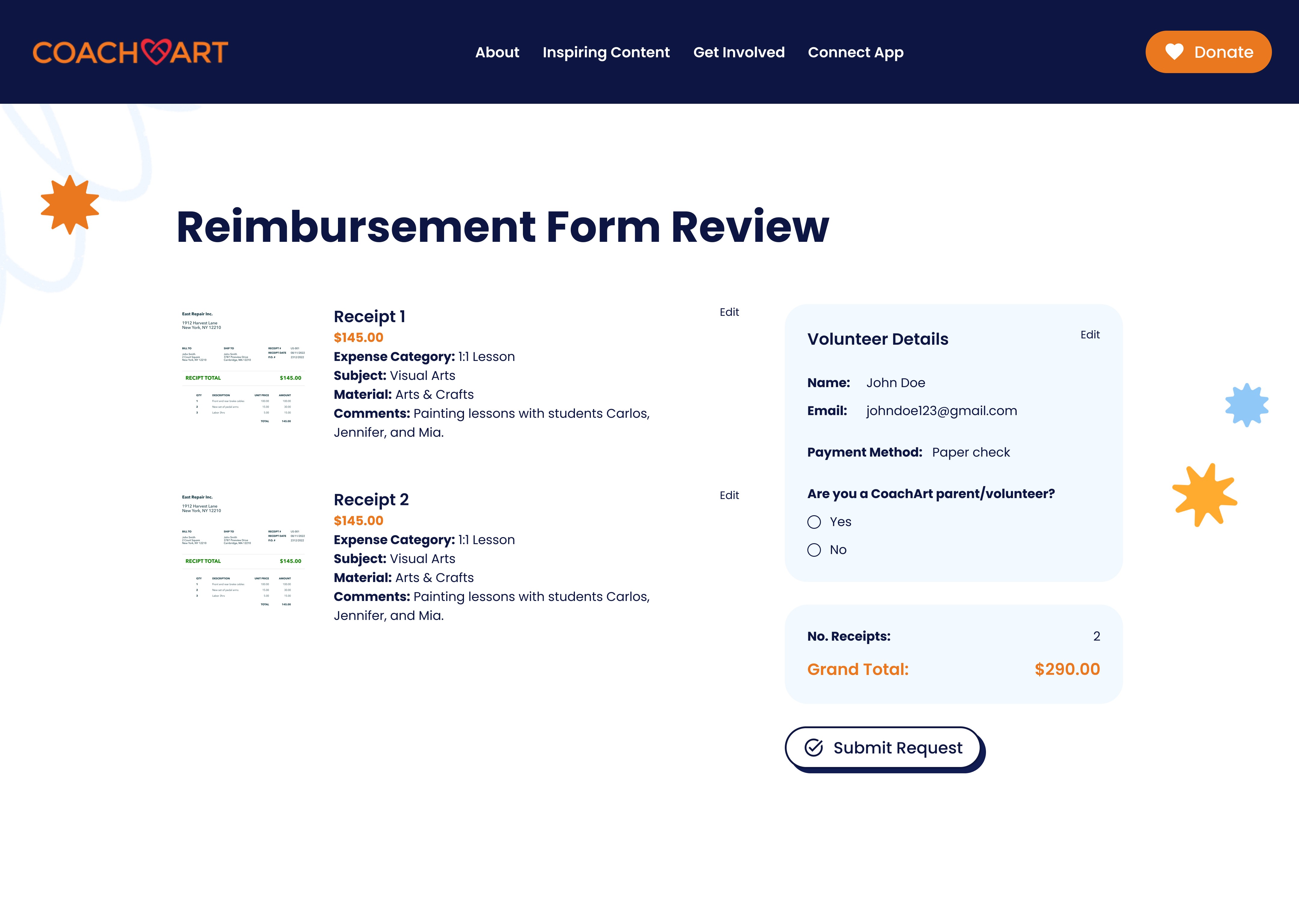 CoachArt volunteers can submit financial requests in two ways. They can file a reimbursement request after purchasing teaching supplies out of pocket by uploading physical receipts for CoachArt to generate a bill, or submit a supply request by sharing e-commerce links so a manager can purchase and ship the supplies directly to the volunteer.