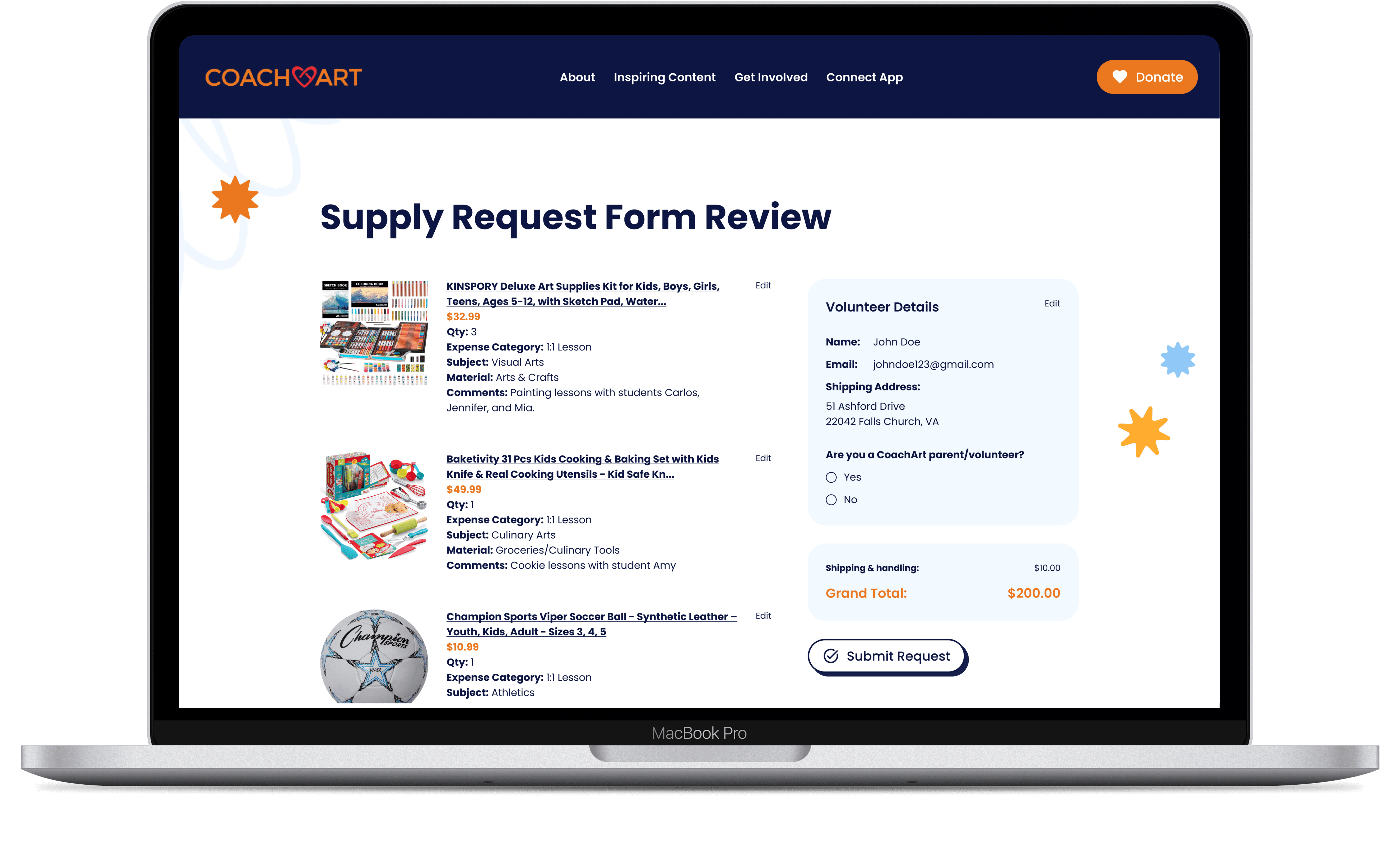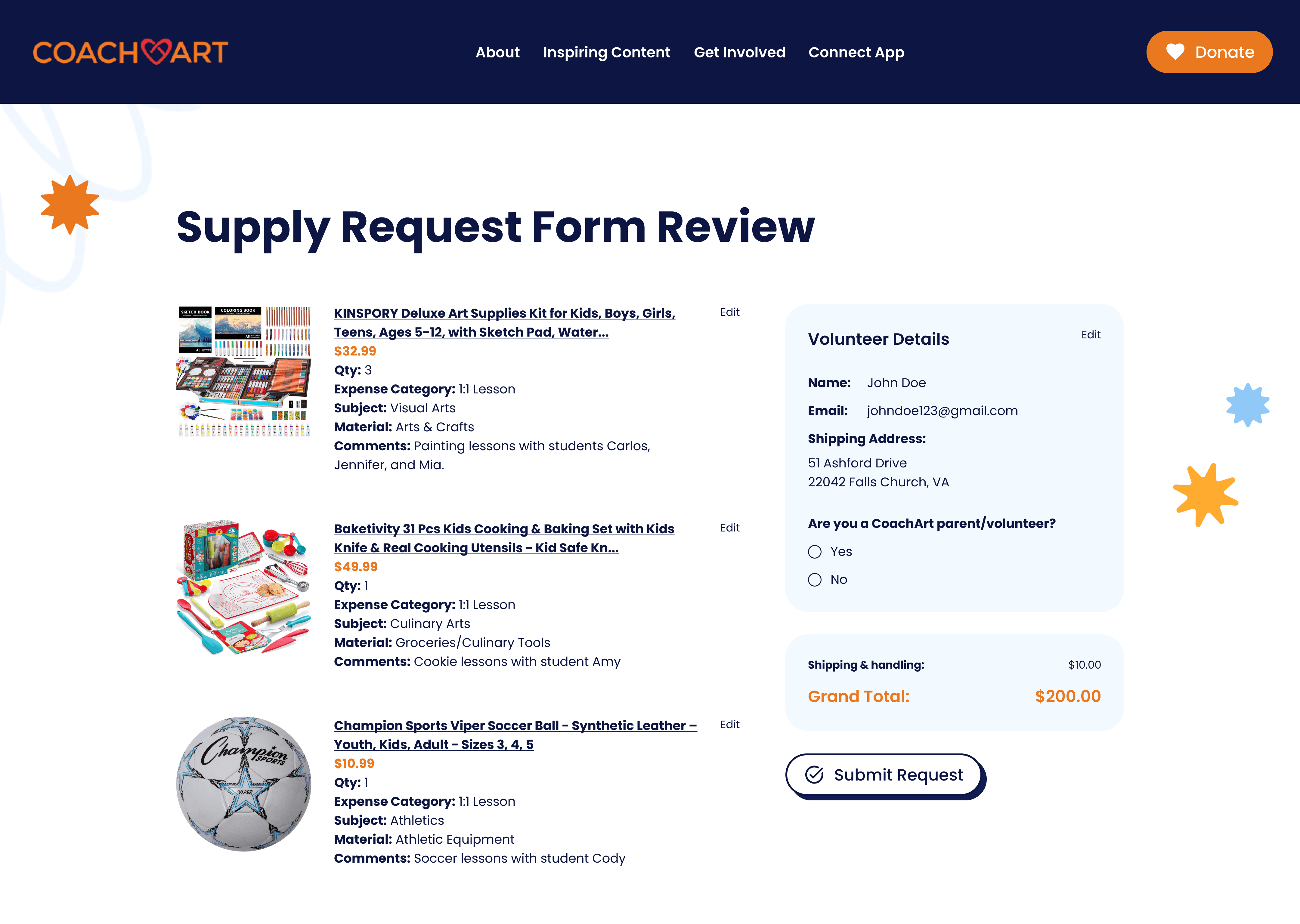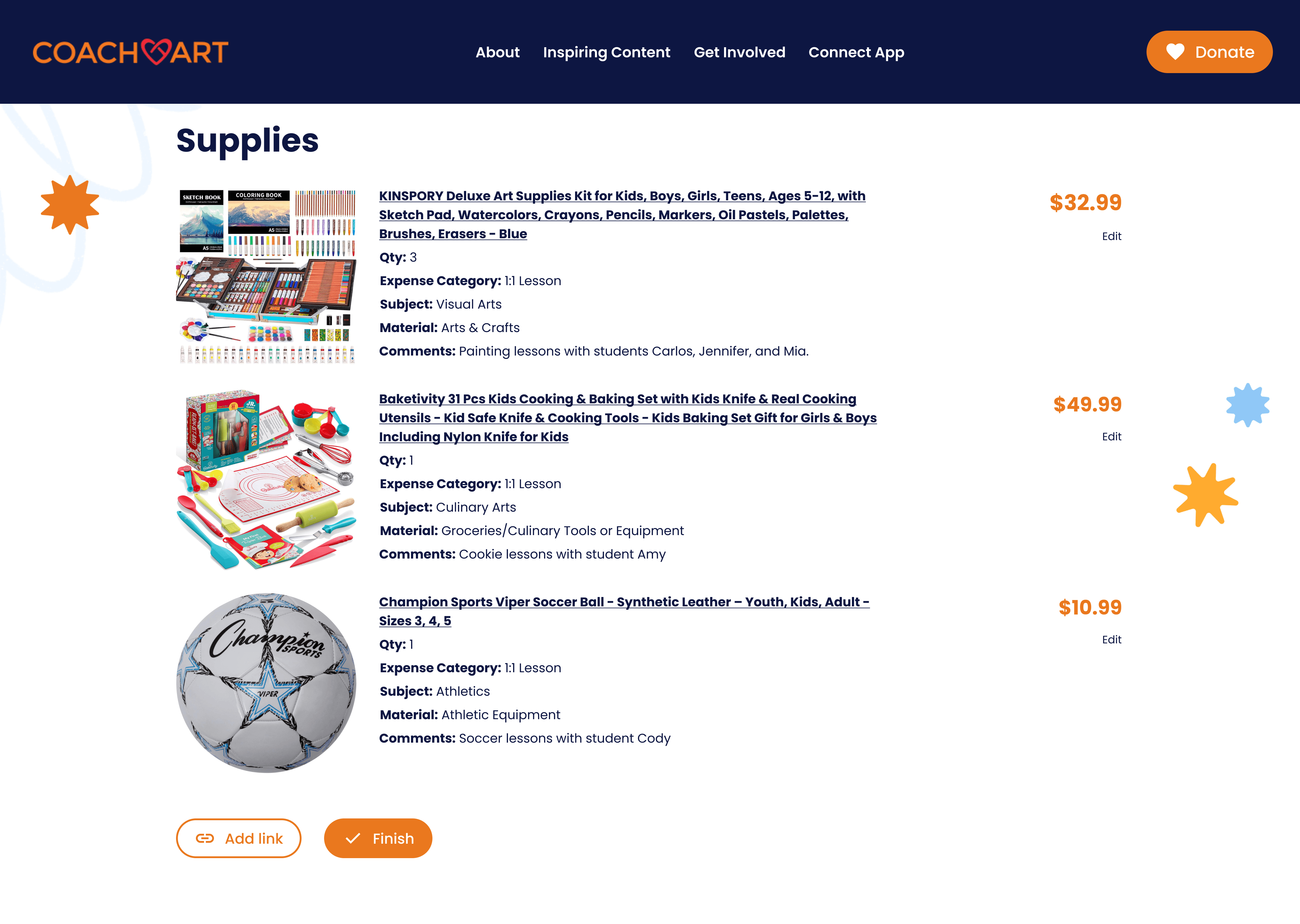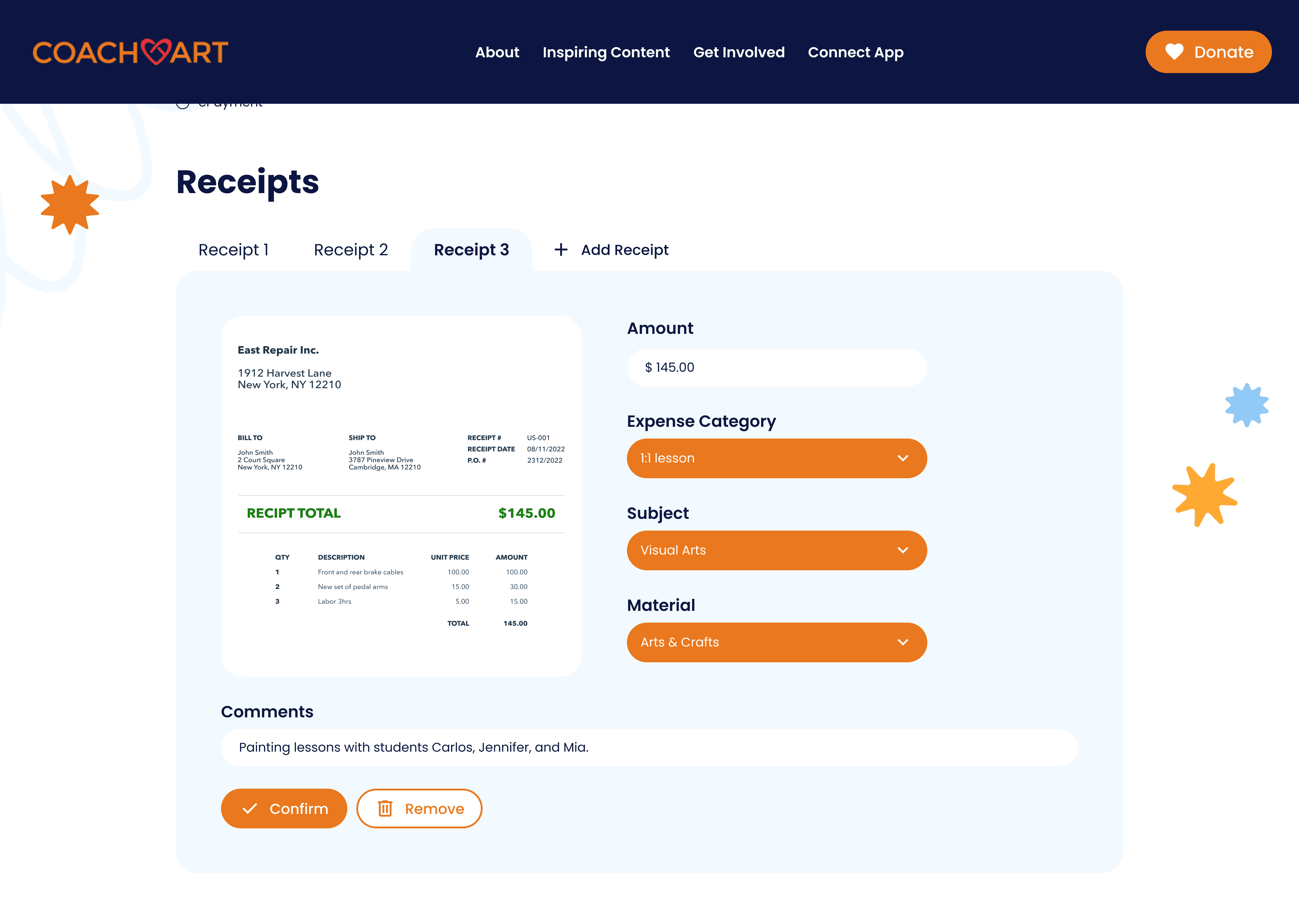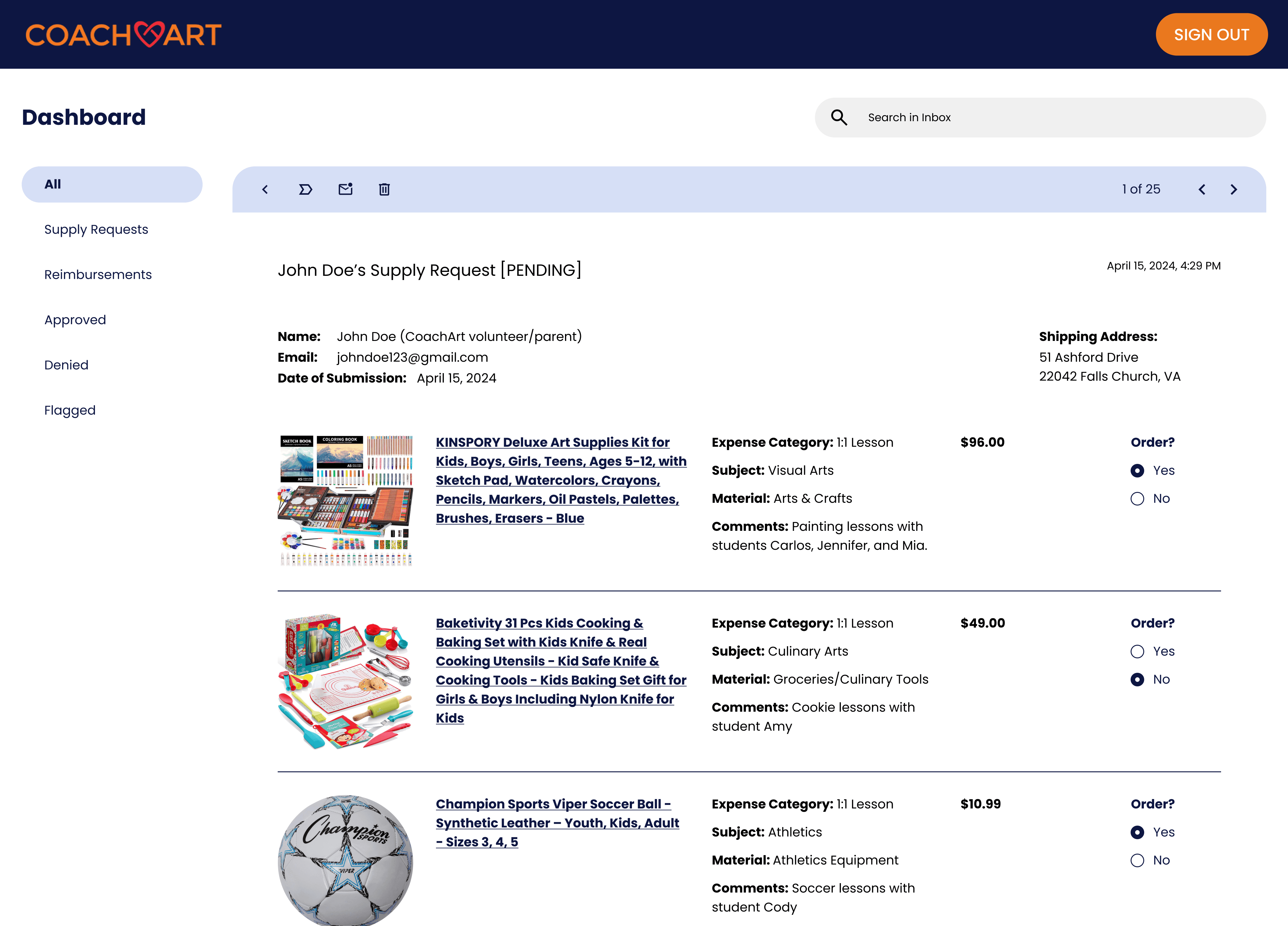 CoachArt volunteers can submit financial requests in two ways. They can file a reimbursement request after purchasing teaching supplies out of pocket by uploading physical receipts for CoachArt to generate a bill, or submit a supply request by sharing e-commerce links so a manager can purchase and ship the supplies directly to the volunteer.