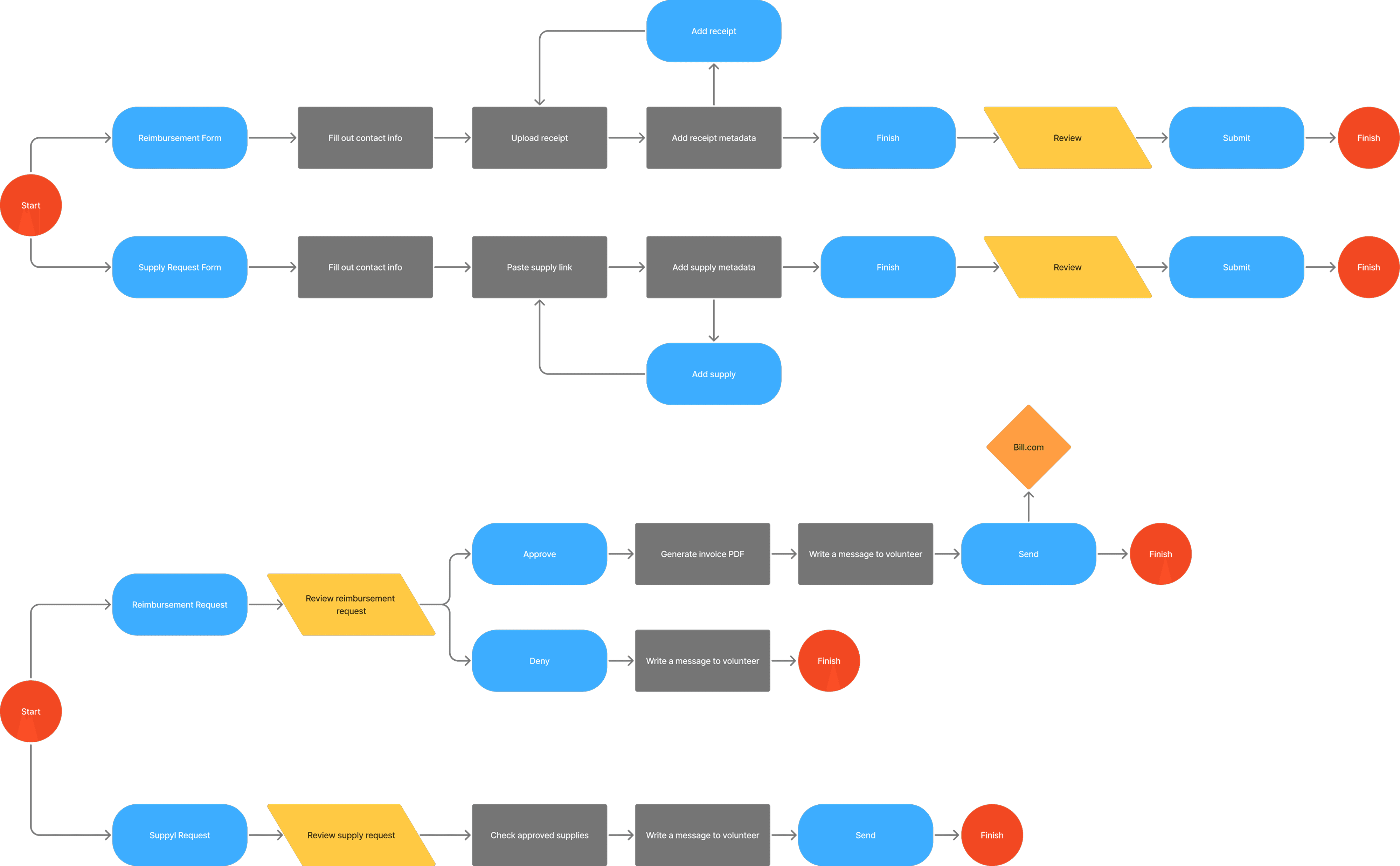 We also mapped the user and data flow within the system, from a volunteer’s form submission, through admin review, to final integration with Bill.com. This visual helped all teams align on data consistency and traceability