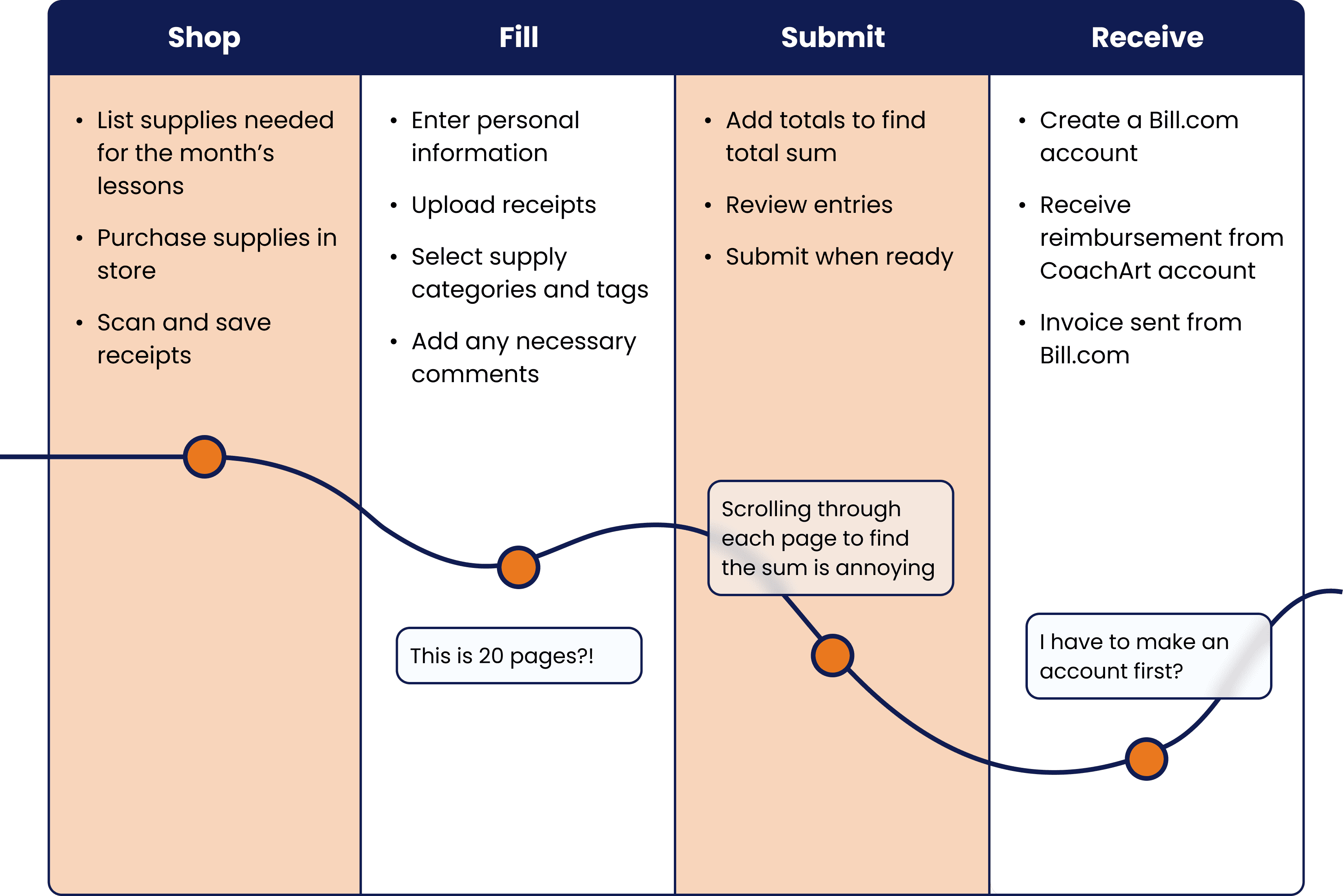 To understand the pain points behind CoachArt’s reimbursement process, we conducted interviews with volunteers and CoachArt staff alike as well as a heuristic evaluations of the existing 20-page Google Form. This helped us uncover not just the procedural steps but also the emotional friction users felt at each stage.